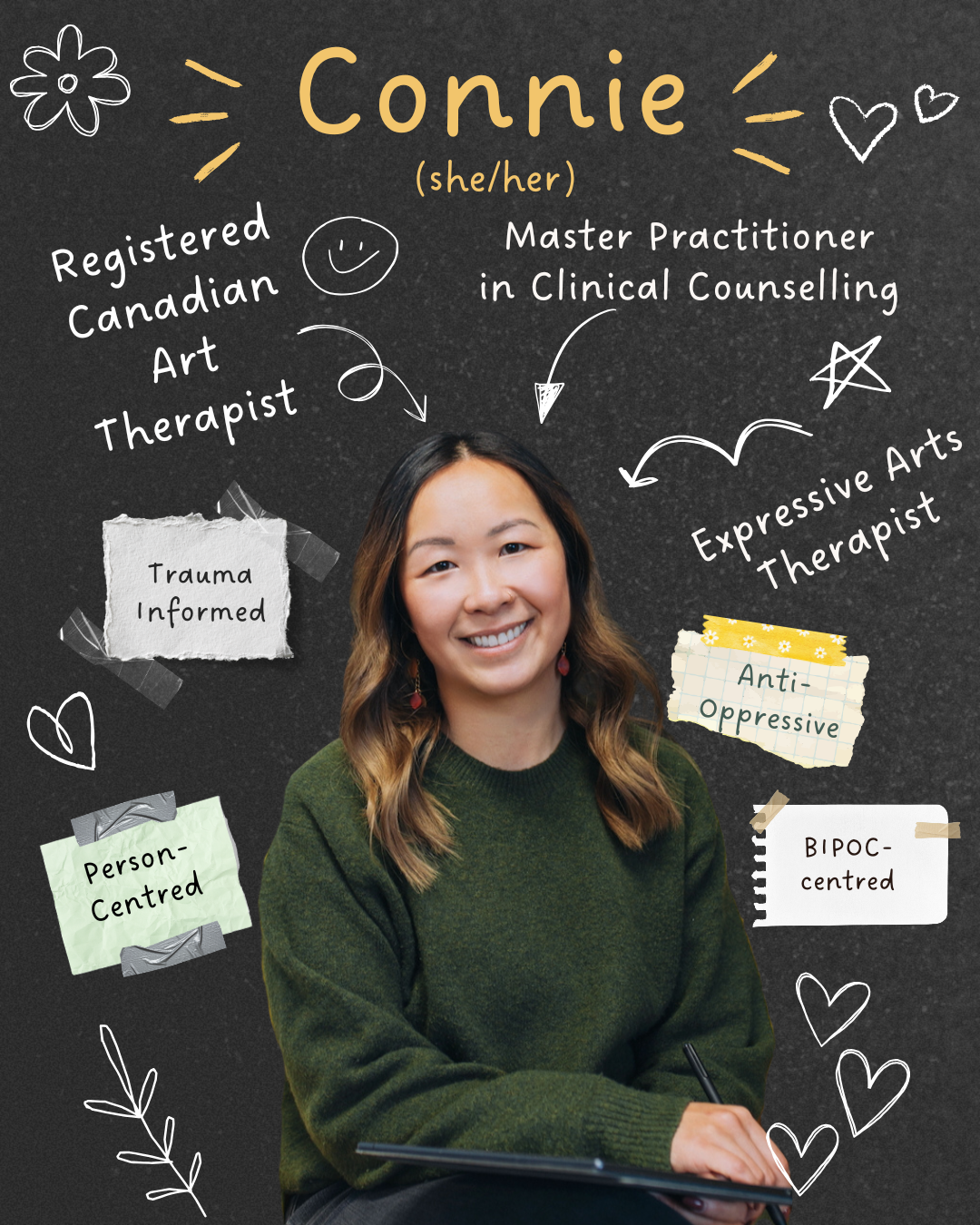 My approach is trauma-informed, anti-oppressive, BIPOC-centred and person-centred.